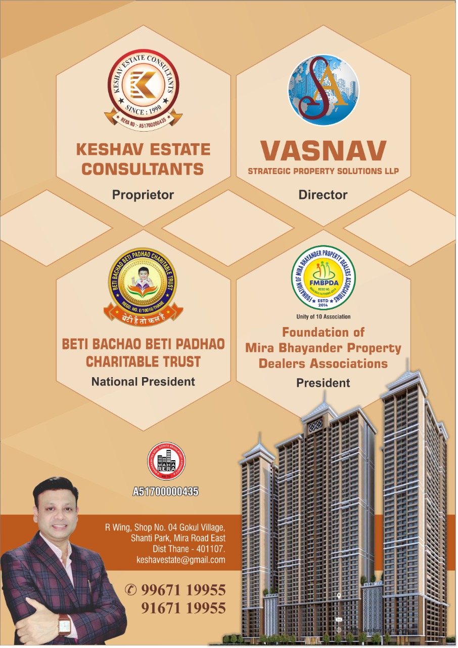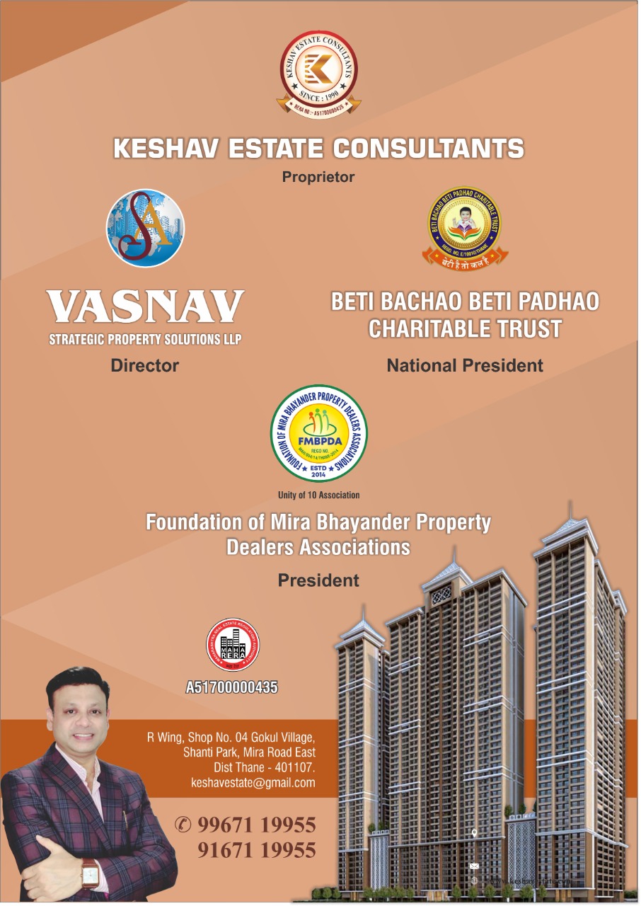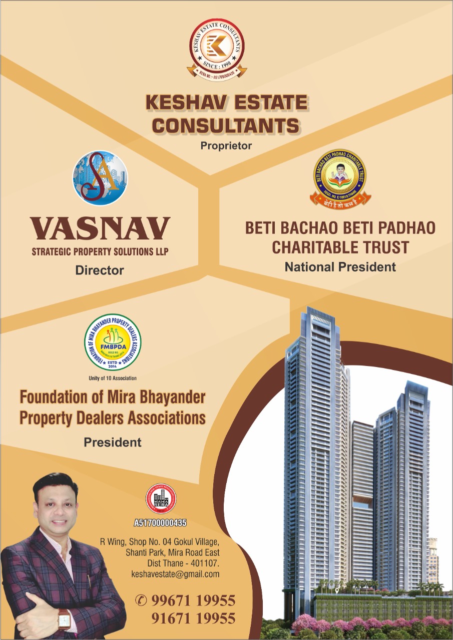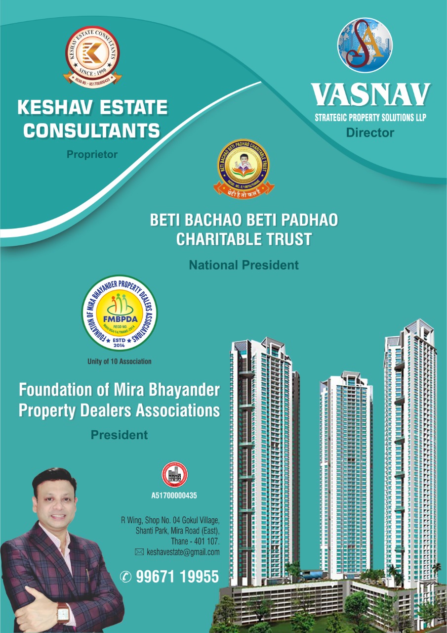 Dr. Ajay L. Dubey founder of KESHAV ESTATE CONSULTANTS with rich thirty years’ of experience and expert in REAL ESTATE BUSINESS. A true leader of industry by supporting channel partner and developer as past president MBPDWA and present PRESIDENT of FMBDA with a federation body of 10 Association of MIRA BHAYANDAR. He is also imparting his social responsibility, by founding a charitable Trust BETI BACHAO BETI PADHAO CHARITABLE TRUST and heading as PRESIDENT which helps the underprivileged girl child.